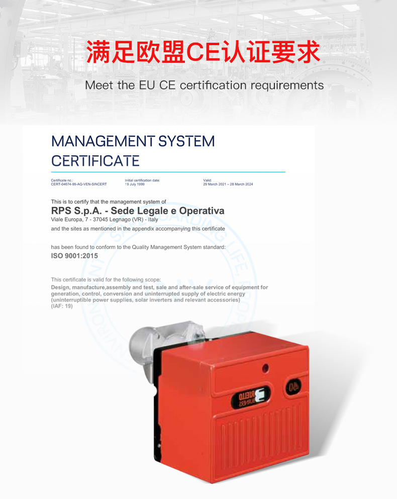 Riello利雅路40 GS5型燃烧器适用于多种燃料及环境下使用,拥有专利机头可以更好的调节火焰尺寸,炉膛适用性更好。产品适用于食品、化工、造纸、纺织、涂装、石油等多种行业。